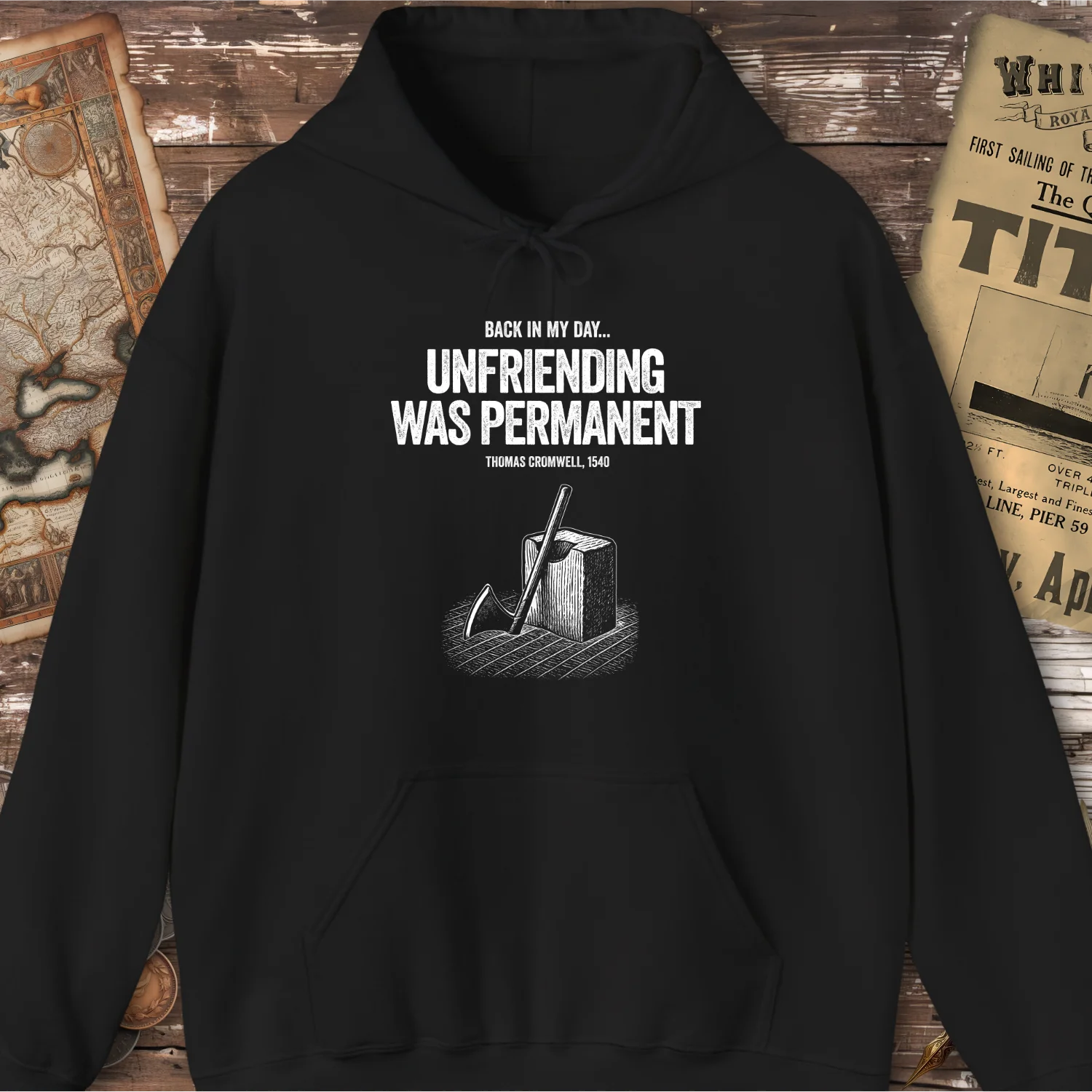 Add a touch of dark humor to your wardrobe with this witty and historically inspired graphic Hoodie. Featuring the bold phrase “Back in my day… unfriending was permanent” with a nod to Thomas Cromwell, 1540, the design cleverly blends modern social media culture with a grim slice of history. The illustration of an execution block and axe drives the point home with a tongue-in-cheek twist.