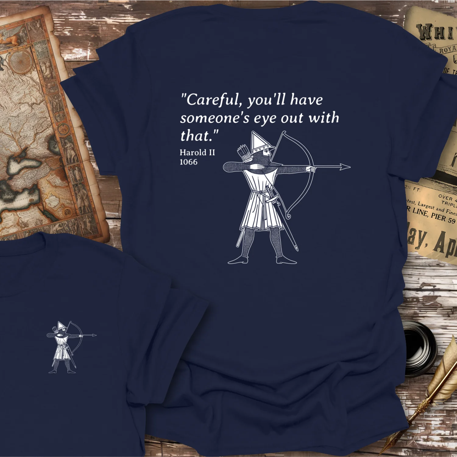 This humorous design features a clever historical joke referencing King Harold II and the infamous arrow incident at the Battle of Hastings in 1066. The design depicts an archer aiming with a quote from Harold II, "Careful, you'll have someone's eye out with that," blending medieval history with dark humor. Perfect for history buffs, fans of medieval warfare, or anyone who appreciates witty historical references.