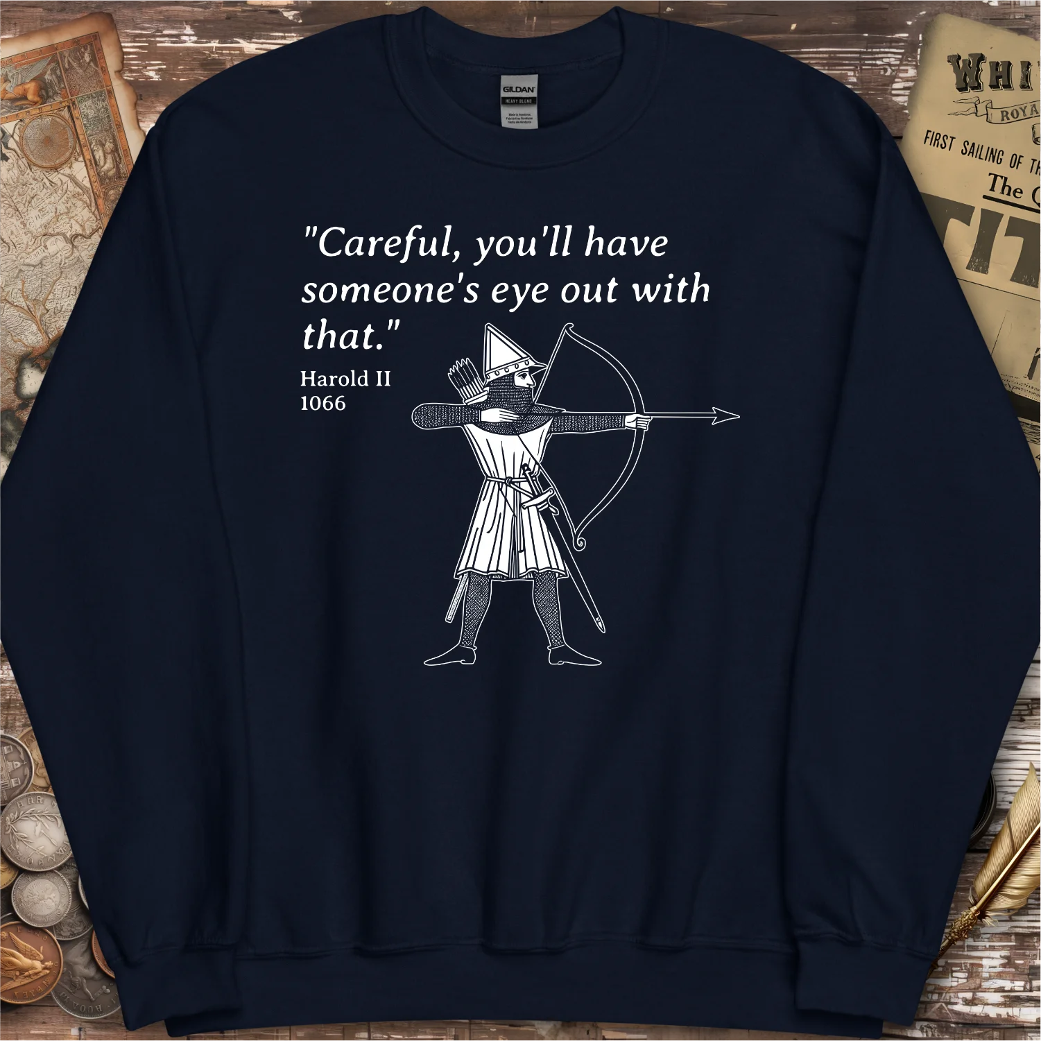 This humorous design features a clever historical joke referencing King Harold II and the infamous arrow incident at the Battle of Hastings in 1066. The design depicts an archer aiming with a quote from Harold II, "Careful, you'll have someone's eye out with that," blending medieval history with dark humor. Perfect for history buffs, fans of medieval warfare, or anyone who appreciates witty historical references.