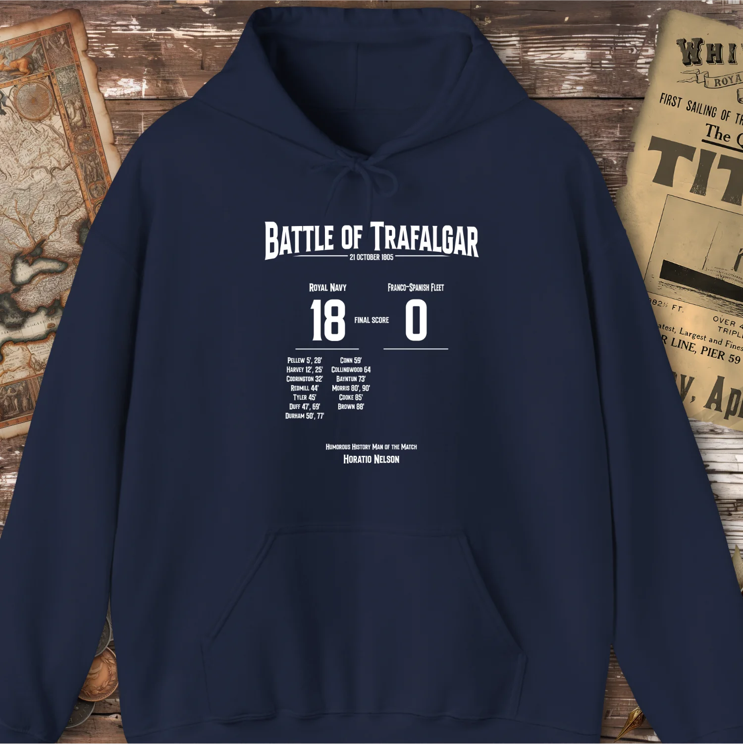 An absolute rout, now recorded in scoreboard form. This “Battle of Trafalgar” Hoodie reimagines Britain’s most famous naval victory as a one-sided football match: Royal Navy 18, Franco-Spanish Fleet 0. Packed with “scorers,” match timing, and crowned with Horatio Nelson as Man of the Match, it’s a beautifully nerdy blend of maritime history and modern match-day sports.
