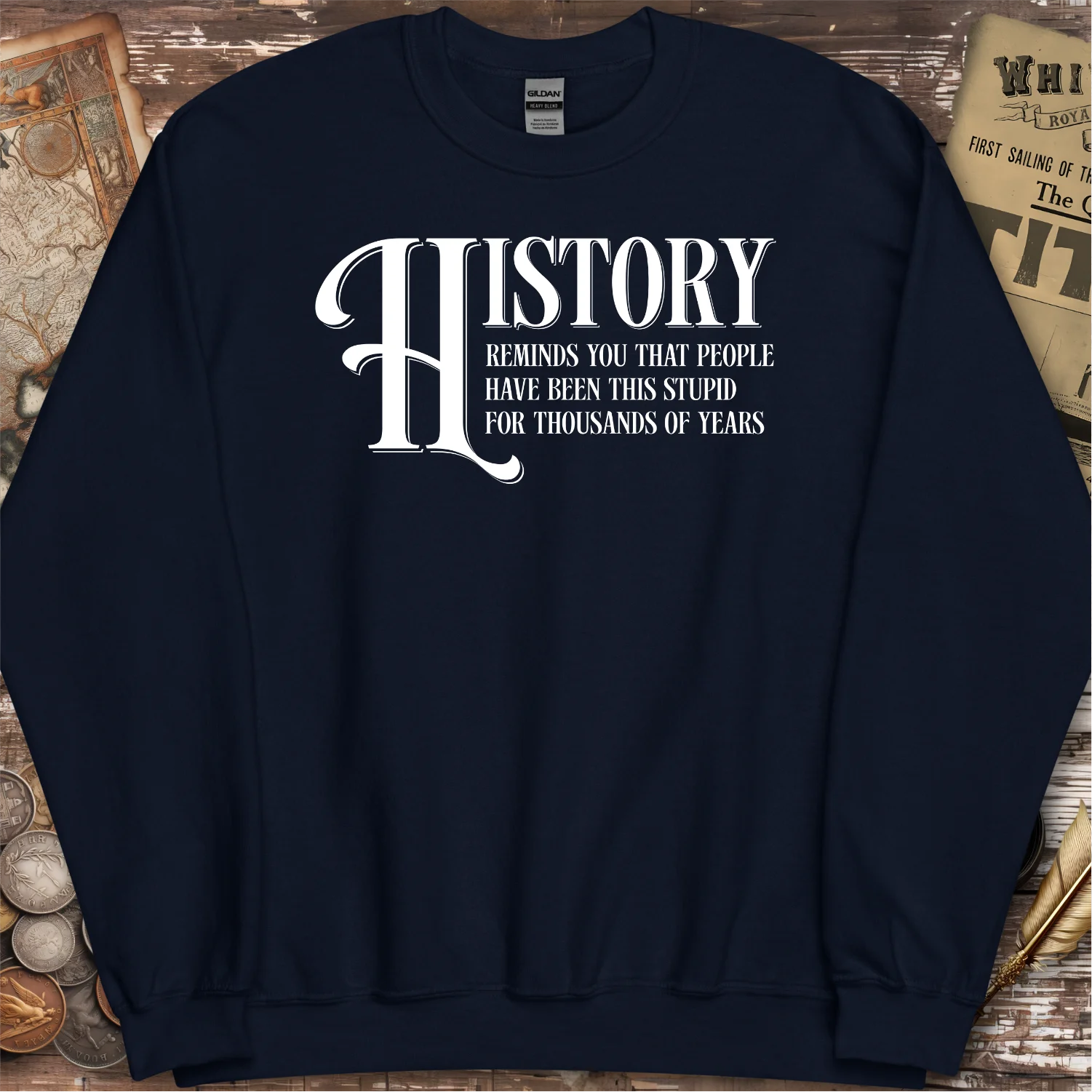 A humorous Sweatshirt featuring a witty quote about history, stating "History reminds you that people have been this stupid for thousands of years." Perfect for history buffs, this vintage-style design in bold typography adds a touch of sarcasm and humor to any outfit. Ideal for those who appreciate a clever, timeless joke.