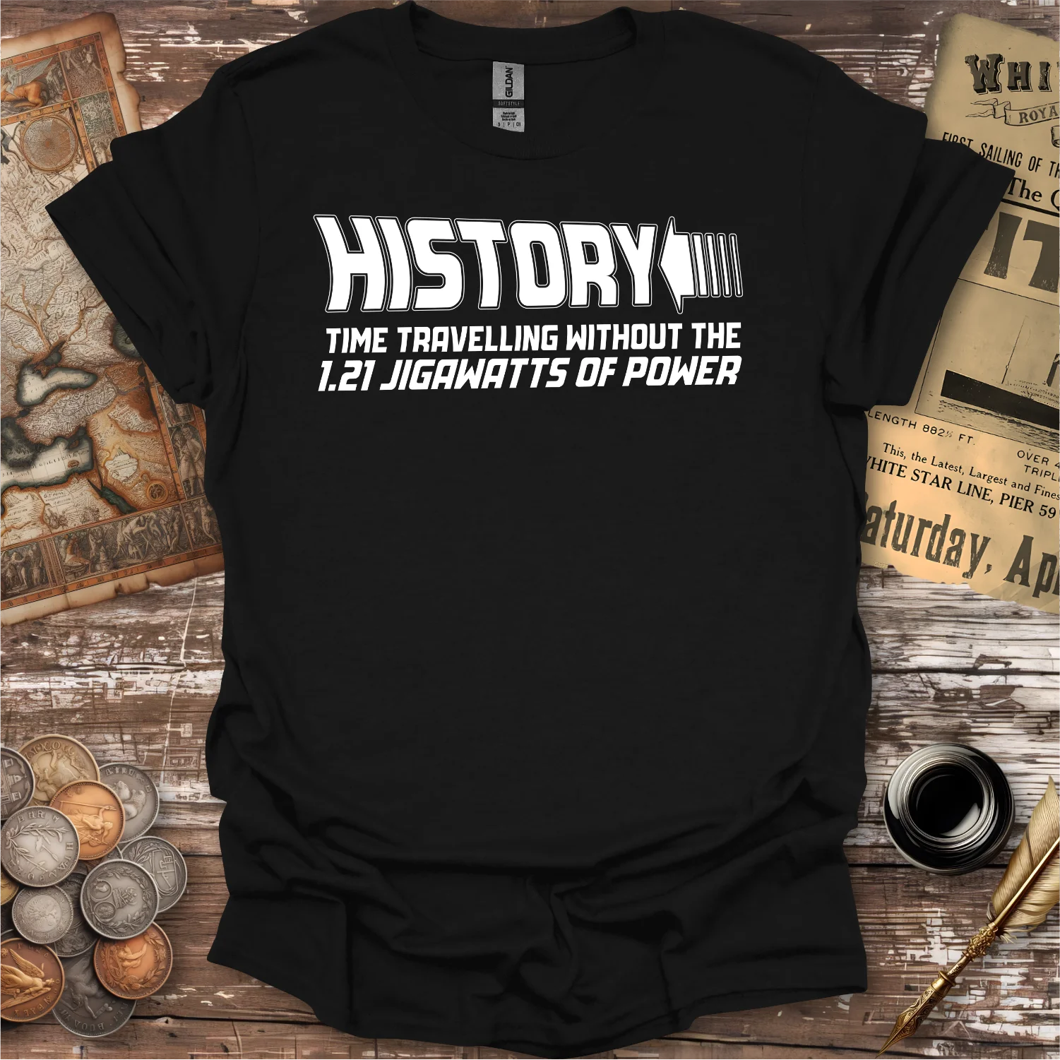 For history lovers who also appreciate a brilliant pop-culture reference, this “History: Time Travelling Without the 1.21 Jigawatts of Power” t-shirt delivers smart humor with minimalist style. Perfect for anyone who knows their past—and their movies.
