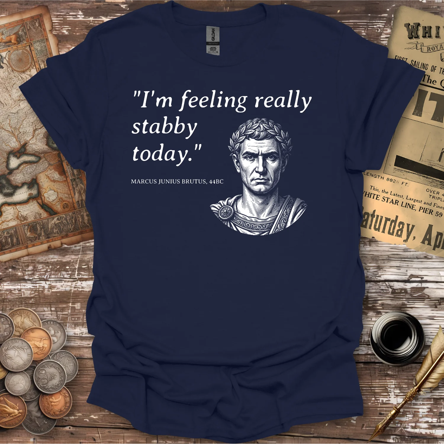 Some days you just want to overthrow a Republic. This shirt captures the ultimate "Monday mood" through the lens of Marcus Junius Brutus and the Ides of March. It’s a witty, irreverent tribute to history's most famous act of political "venting."