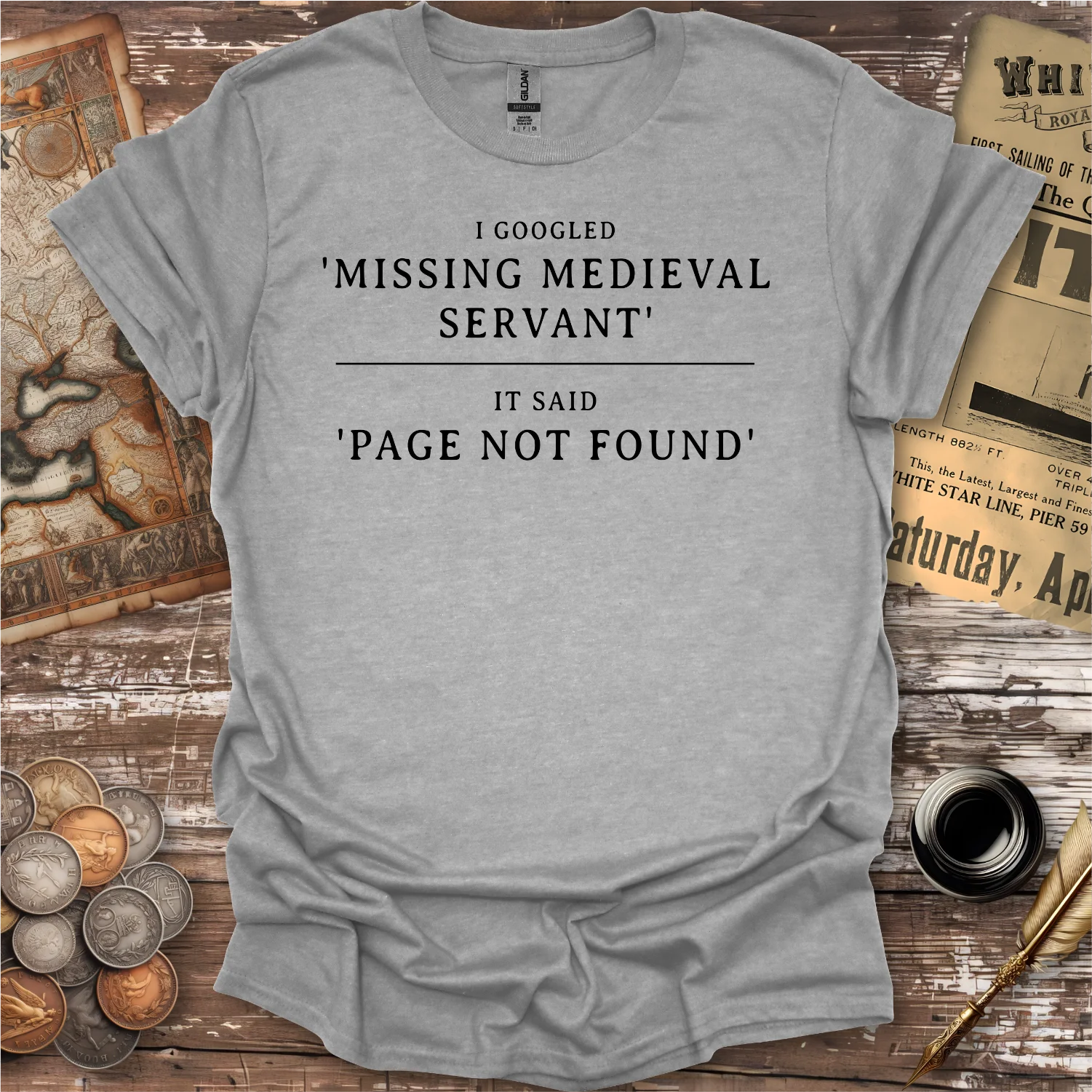 Smart, dry, and effortlessly funny, this “I Googled ‘Missing Medieval Servant’ – Page Not Found” t-shirt blends modern tech humor with medieval absurdity. Designed like a clean text quote, it imagines what would happen if Google existed in the Middle Ages—and the result is exactly what you’d expect.