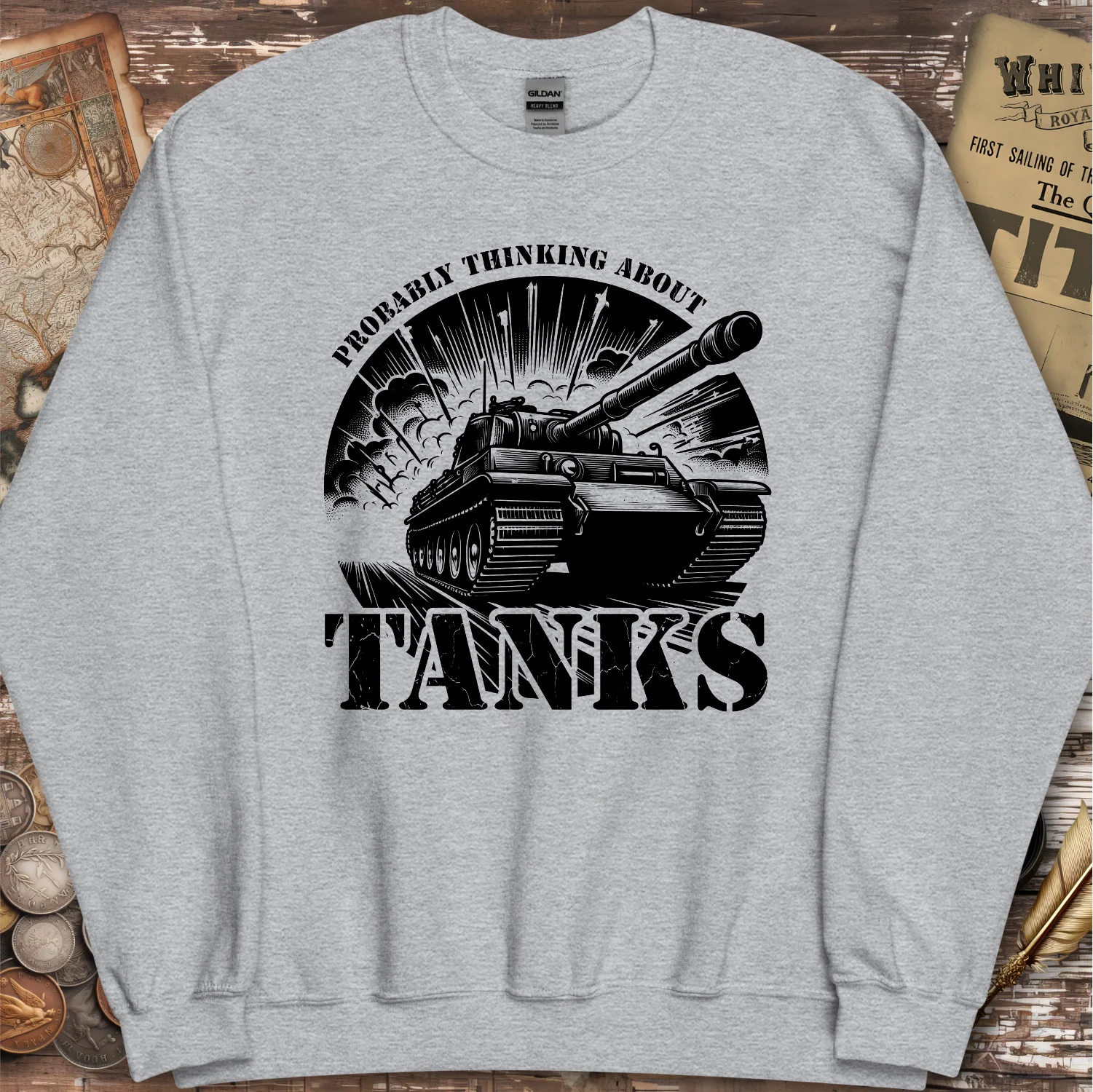 This Sweatshirt features a striking tank graphic with an explosive background and the humorous text "Probably Thinking About Tanks." Ideal for military history buffs, tank lovers, and anyone with a passion for armored vehicles.