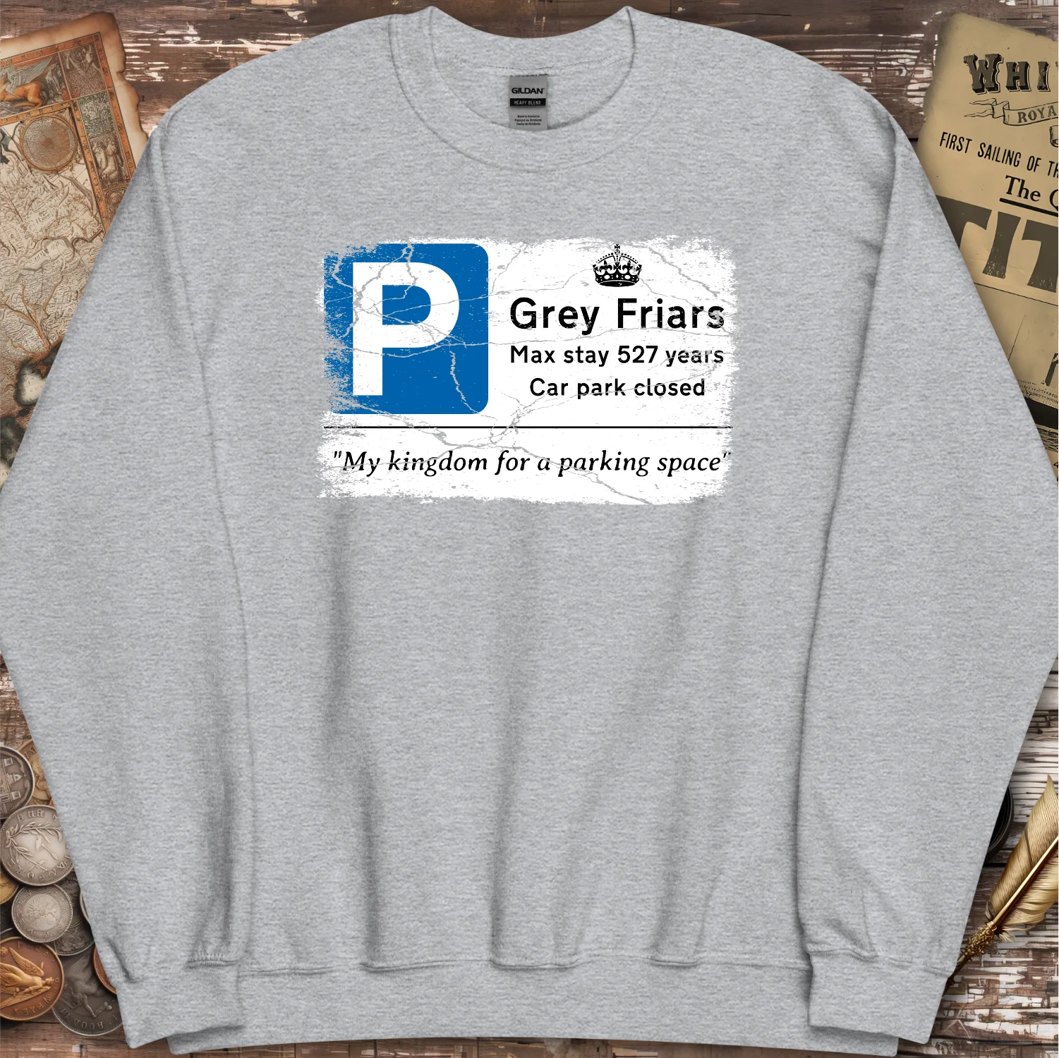 This hilarious Sweatshirt blends medieval history with modern humor, featuring a clever parody of Grey Friars Car Park, the final resting place of Richard III, along with the famous "My kingdom for a horse" quote. Designed with a cracked, vintage-style parking sign, this witty shirt is perfect for history buffs, Shakespeare enthusiasts, or anyone who loves a good pun. A unique conversation starter and a great gift idea!