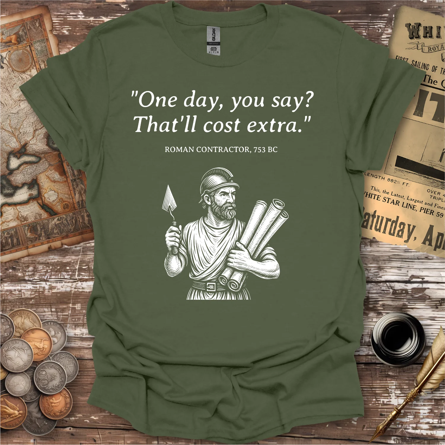 Bring ancient humor to the modern day with this witty Roman-themed graphic tee. Featuring a detailed illustration of a Roman contractor holding scrolls and a trowel, the shirt is paired with the tongue-in-cheek quote “One day, you say? That’ll cost extra.” – Roman Contractor, 753 BC.