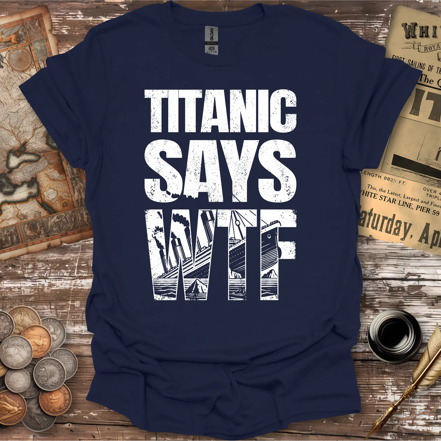 When confidence meets catastrophe, this “Titanic Says WTF” t-shirt delivers razor-sharp dark humour with a bold, instantly recognisable design. Featuring distressed block lettering and a striking vintage-style illustration of the doomed liner, it perfectly captures that split second between “unsinkable” and oh no.