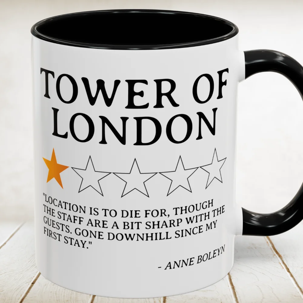 This humorous Mug features a satirical one-star review from Anne Boleyn about her "stay" at the Tower of London, complete with a witty quote and star rating. Perfect for fans of dark humor and British history.